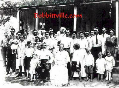 BACK ROW. l. to r.: Mr. Holderness (a neighbor). James Edward Bobbitt (holding baby Lois Bobbitt). Mrs. holderness, Ola Fields Bobbitt, Oscar George McNial, the Holderness' daughter (with bow in hair), baby Oscar McNial Jr., Nancy Nelsina Emma Elizabeth Bobbitt McNial, Odus Aslin, Mamie Edna Bobbitt Aslin, baby Hazel Louise Vaughn, Andrew Jackson Vaughn, William Jerimah Vaughn, Dora Ann Rebecca Jane Francis Bobbitt Frank, Mary Alice Bobbitt Vaughn, Everett G. Frank, Luna Hazel Bobbitt Cope, Robert Jackson Denny, Asa F. Cope, Ida Caroline Bobbitt Denny