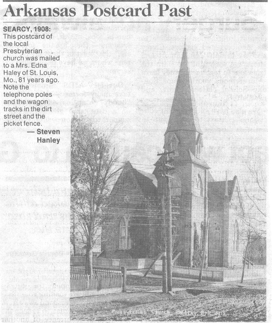 2000 When settlers came from Tennessee during the early 1800s, they brought with them their church beliefs, resulting in the formation of the Cumberland Presbyterian Church in White County. The church membership today is celebrating 150 years of existence in White County with a church service and potluck luncheon. The church was organized July 16, 1850, by Alexander Stevenson and J.A. Wilson, who were ministers from Tennessee, according to Howard Johnson, a Search church elder and clerk of session. However, members were an active influence in White County for several years prior to the actual organization. "Friday 4, 1810, in Dixon County, Tennessee – the men prayed all night before they decided to break away," Johnson offered. Members first began meeting in the homes of members. The Burrow, Steele and Meek families were among the charter members. The Cumberland Presbyterians formed the Arkansas Presbytery in 1824 and began to dispatch preachers throughout the area, Johnson offered. A publication entitled "Searcy, Arkansas – A Frontier Town Grows Up With America" written by Raymond Lee Muncy says R.D. King claimed that at his meetings there were grown men who had never heard a public prayer, much less a sermon. The Methodists formed the Little Red River Mission in 1842 with Bishop A.L. Kavanaugh in charge. Searcy was then made a post on a circuit rider’s rounds. In 1851, Israel Moore deeded the church a lot and a small log cabin was built on the southeast corner where Main and Race streets intersect and served as Searcy’s first church building. James Kellum, Stephen Perry and Robert Carlisle were among the charter members. The name of the mission was changed to Searcy Mission and R.G. Brittian became Searcy’s first resident Methodist preacher. The Baptists began meeting in 1847 but were not organized until June 1851 under the name of Shiloh Baptist Church of Christ by Elder John Goad. In 1853, Henry Becket gave property at Arch and Gum streets, across from the Wilbur D. Mills Court Building, to the church for the purpose of locating a meeting place. The church was never built at this location. On May 28, 1859, Johnson said, the Cumberland Presbytery and the Southern Presbyterian agreed to jointly purchase a lot, building a church at the current location, the corner of Spring and Race streets. It was a wooden structure, according to Johnson. This arrangement continued until the Cumberland Presbyterian Church purchased the Southern Presbyterian's interest. The Southern Presbyterian purchased a lot at the corner of East Center and Main in 1891, Johnson offered. A sidewalk leading to the blank wall remains today. ( Land purchased June 17, 1859 for $100 from Paul Sanford Book F, page 602, White County Courthouse ) In 1903, while F.Z.
